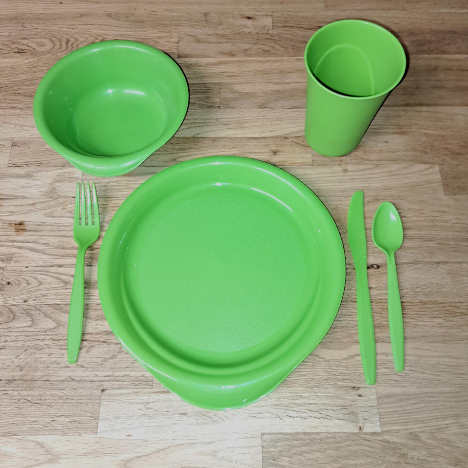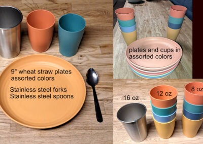 In partnership with Rubbish Renewed, there are reusable wheat-straw plates and cups, stainless steel cups, forks and spoons. About 200 of the plates and each cup size. About 200 forks and about 120 spoons. They also put together a really nice kit with bus tubs to wash the gear, collapsible table to organize everything, signage and more, all in some really nice totes and rolling job boxes. Inquire for more on that setup.